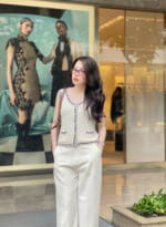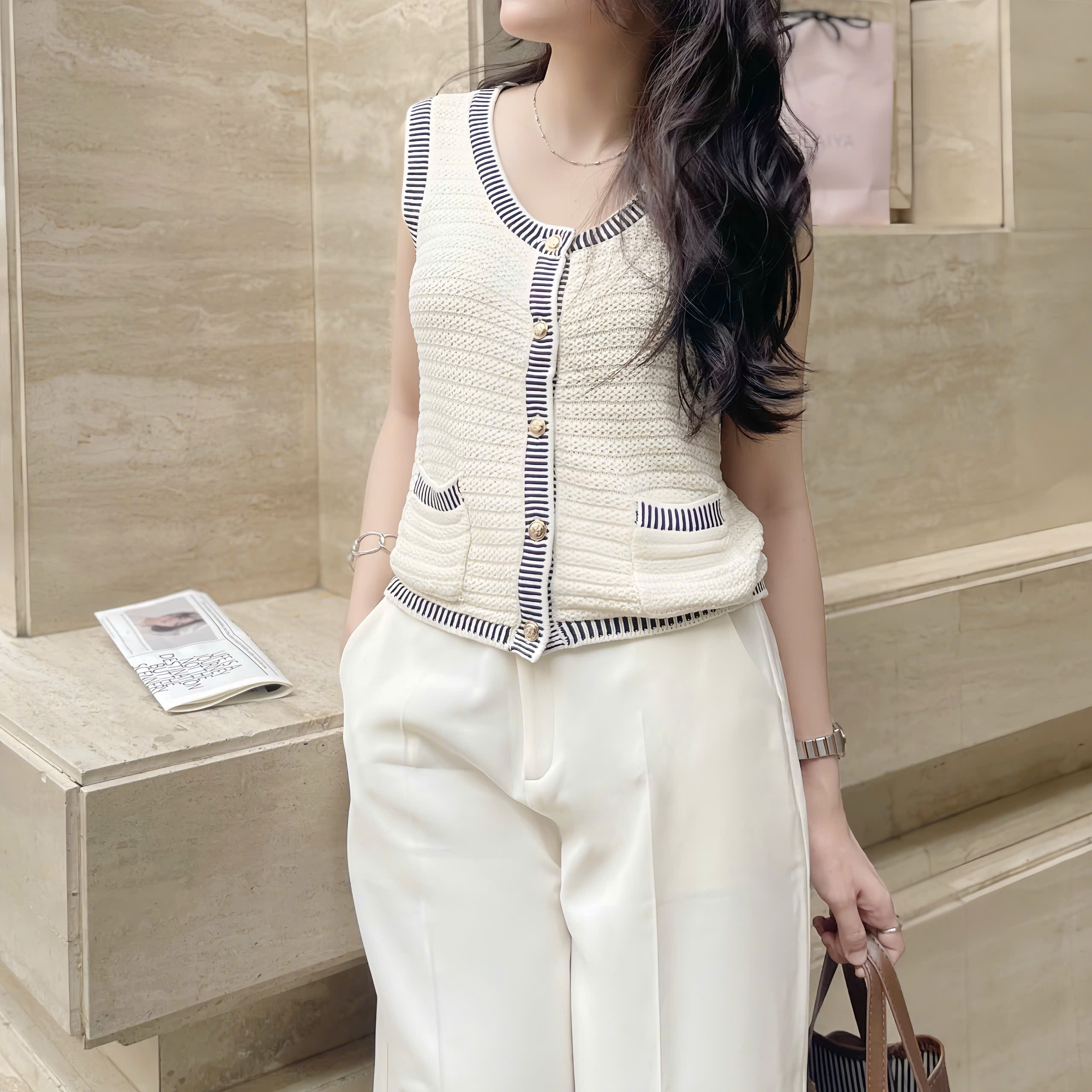 Thiết kế: Không tay, cổ tròn thanh lịch, phối viền sọc đen – trắng tinh tế. Phần túi tạo điểm nhấn trẻ trung.